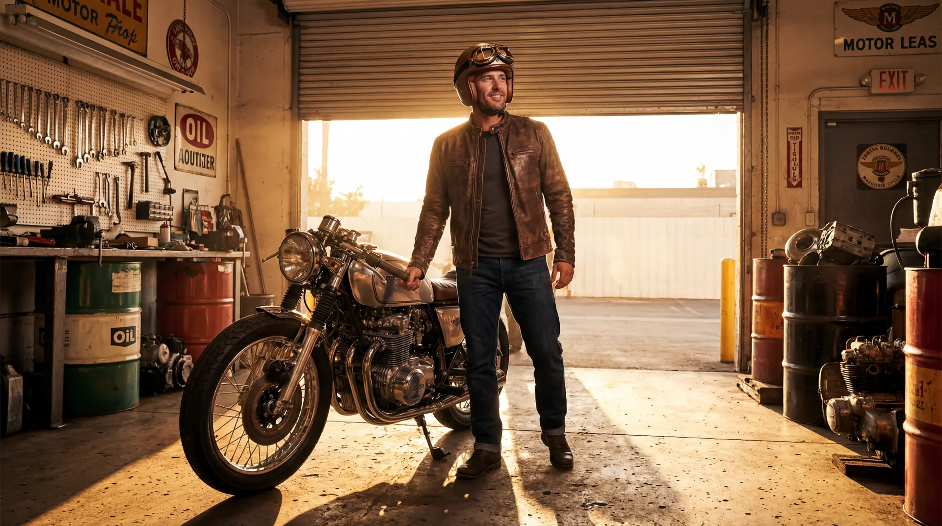 El equipamiento cafe racer no es disfraz. Es funcional, seguro y envejece contigo. Cada marca de cuero, cada aranazo en el casco, cuenta un viaje que hiciste.